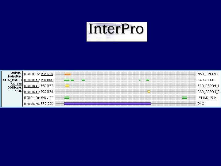 Entry types in Inter. Pro • Family group of evolutionarily related proteins, that share one or more domains/repeats in common. • Domain independent structural unit which can be found alone or in conjunction with other domains or repeats. • Repeat region occurring more than once that is not expected to fold into a globular domain on its own. • PTM (post-translational modification) The sequence motif is defined by the molecular recognition of this region in a cell. • Active site catalytic pockets of enzymes where the catalytic residues are known. • Binding site binds compounds but is not necessarily involved in catalysis.