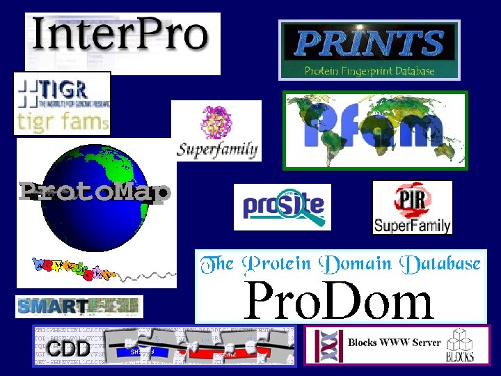 Банки белковых семейств и доменов, производные от банков аминокислотных последовательностей Коллекции мотивов Коллекции доменов PROSITE , 1989 BLOCKS PRINTS Pfam SMART Pro. Dom, 1995 SUPERFAMILY Inter. Pro, 1999 (Integrated Resource of Protein Families)