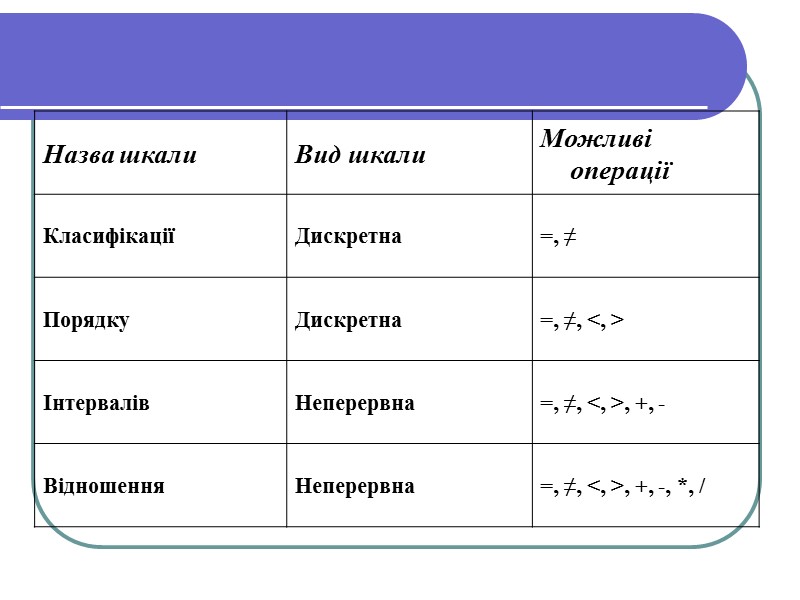Шкали вимірювання Вимірювання – присвоєння чисел предметам або подіям, що базується на деякій системі правил. Залежно від операцій, які можна виконувати над вимірюваними величинами (=, ≠, <, >, +, -, *, /), існують такі типи шкал вимірювання: