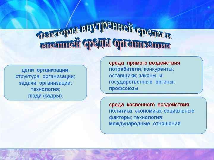 Организация Внутренняя среда Внешняя среда