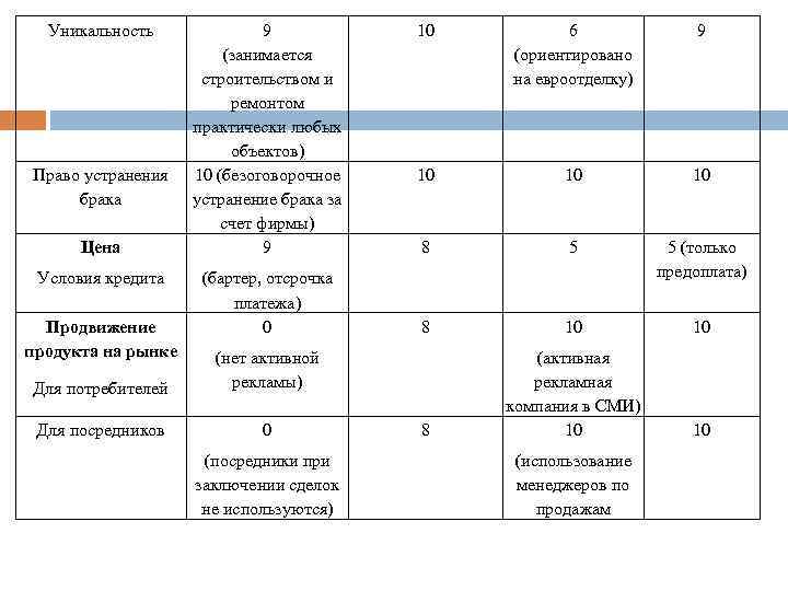 Уникальность Право устранения брака Цена Условия кредита Продвижение продукта на рынке 9 (занимается строительством и ремонтом практически любых объектов) 10 (безоговорочное устранение брака за счет фирмы) 9 (бартер, отсрочка платежа) 0 Для потребителей 0 6 (ориентировано на евроотделку) 9 10 10 10 8 5 5 (только предоплата) 8 10 10 8 (активная рекламная компания в СМИ) 10 10 (нет активной рекламы) Для посредников 10 (посредники при заключении сделок не используются) (использование менеджеров по продажам