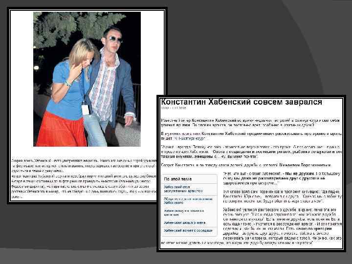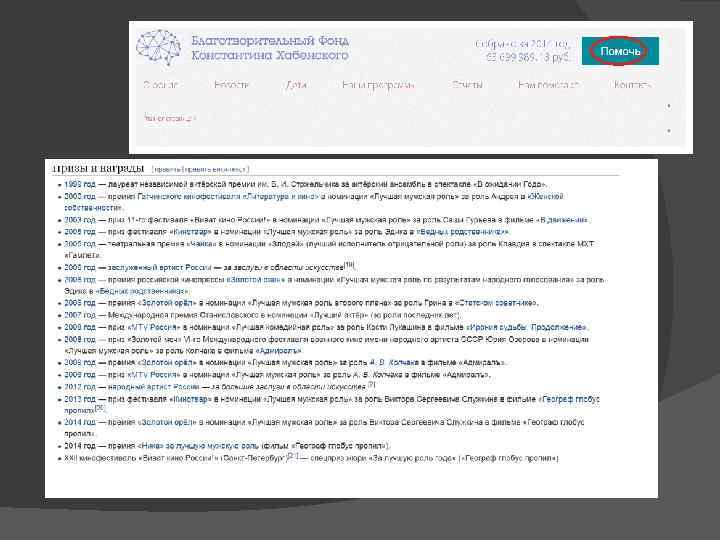 «+» Константин Хабенский поддерживает множество общественных проектов. Под его руководством работает благотворительный фонд, который оказывает помощь детям больным раком, в частности, детям с опухолью мозга. Также Константин помогает и пожилым актерам. В настоящее время в 12 -ти городах России открыты «Студии творческого развития Константина Хабенского» , в которых профессиональные актеры из местных театров бесплатно занимаются с детьми актерскими дисциплинами: пластикой, художественным словом, кукольным театром. «-» Очень часто был замечен прилюдно в нетрезвом виде и при этом непристойно себя вёл.