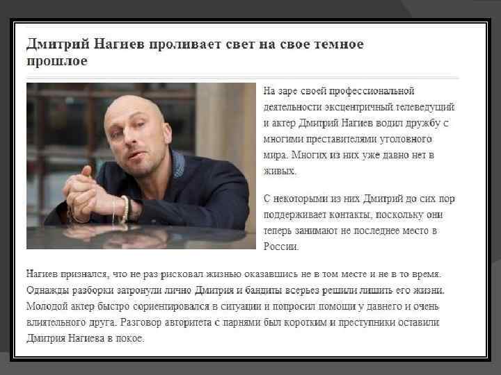 «-» Занимался фарцовкой, за что привлекался к уголовной ответственности. очень много прилюдных несдержанных выходок слишком много несерьезных, высмеивающих уклад страны, публичных выступлений «+» Является председателем правления благотворительного фонда «Анна» Был ведущим на «Радио. Модерн» и 4 раза признавался лучшим радиоведущим страны.