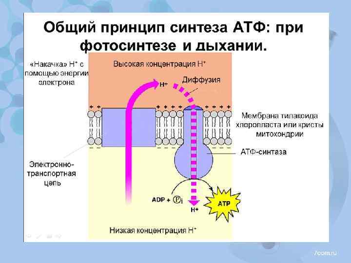 Общая схема процессов фотосинтеза На свету: 1)квант света выбивает электрон из хлорофилла, хлорофилл переходит в возбужденное состояние, электрон идет по электронтранспортной цепи; 2) фотолиз воды необходим для выделения O 2 и отдачи электрона возбужденному хлорофиллу (возвращения хлорофилла в его основное, обычное, состояние); 3) идет синтез АТФ И НАДФН.