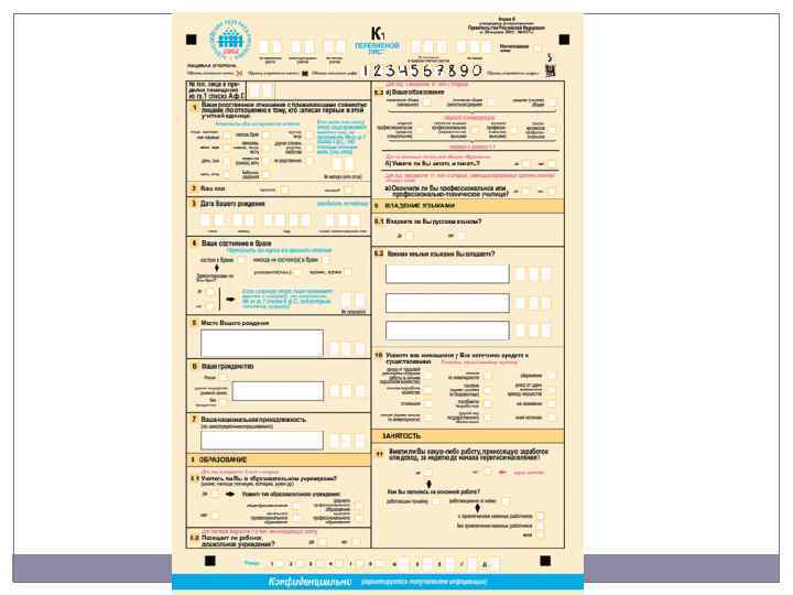 Признаки в переписном листе сплошной переписи: отношение к главе семьи, пол, причина и время отсутствия в месте переписи (для временно отсутствующих по постоянному месту жительства), возраст, семейное положение, национальность, гражданство (для иностранцев), родной язык, другой язык народов СССР, которым опрашиваемый свободно владеет, образование, тип учебного заведения (для учащихся), источник средств существования.