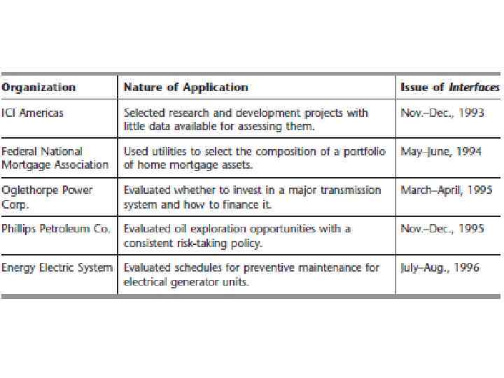 Для собственных причин, компании не публикуют статьи в профессиональных журналах, чтобы описать свои методы приложения, в том числе анализа решений. Некоторые появляется в журнале называется интерфейсов. Статьи о теории принятия решений позволяет получить важную информацию о практическом применении этой методики на практике. Таблица суммирует характер некоторых применений анализа решений появились в интерфейсах. Правой колонке идентифицирует конкретный номер журнала для каждого приложения. В других столбцов широкое разнообразие организаций и приложений (с коммунальными как тяжелых пользователей). Для каждого конкретного применения, подумайте о том, неопределенности в ситуации сделать анализ решений естественный метод использовать.