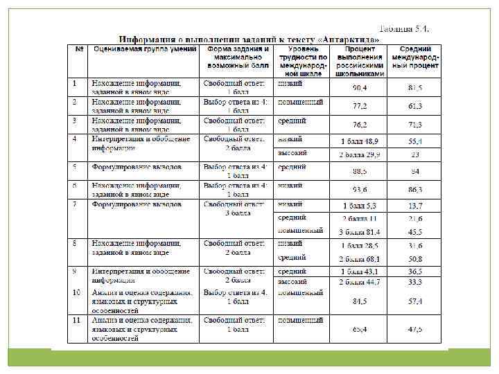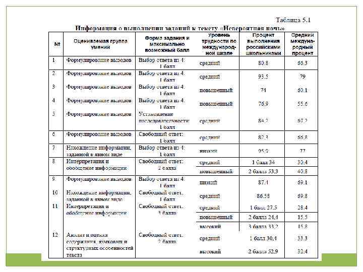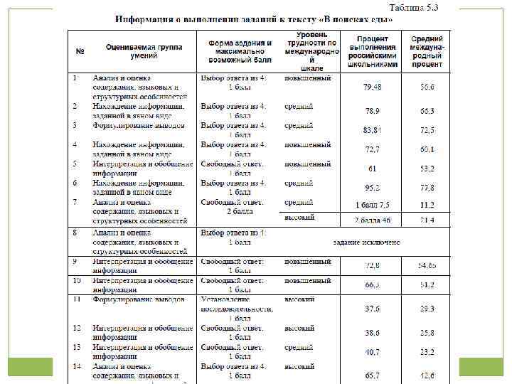ВЫВОДЫ: прослеживается тенденция неточного восприятия заданий, неумения удержать все составные части задания в поле зрения в процессе записи ответа учащиеся не получают максимальный балл за задания, в которых нужно привести два примера, останавливаясь после записи первого трудность представляют задания, в которых необходимо не только привести пример, но и что-либо объяснить, доказать учащиеся забывают выполнить вторую часть задания трудность вызывают задания, для выполнения которых нужно обобщить информацию Трудность представляют задания, в которых необходимо не только выбрать какое-либо утверждение, но и объяснить свой выбор, привести примеры, доказывающие его. За такие задания значительный процент российских школьников получал 0 баллов, т. к. они лишь выбирали утверждение и не приводили доказательств своего выбора неумение наших учащихся использовать разные стратегии работы с разными типами текстов