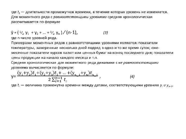 Средние показатели рядов динамики являются обоб щающей характеристикой его абсолютных уровней, аб солютной скорости и интенсивности изменения уровней ряда динамики. Различают следующие средние показа тели: редний уровень ряда динамики, средний с абсолют ный прирост, средний темп роста и прироста. Средний уровень ряда динамики рассчитывается по средней хронологической. Методы расчета среднего уровня моментного и интер вального рядов различны. В интервальном ряду динамики (у1, у2, … , уt, … , уn) с равными периодами времени расчет среднего уровня производится по формуле простой средней арифмети ческой: (1) Примерами интервальных рядов с равными периодами являются: объемы ежемесячных продаж за один год или за несколько лет; ежегодные объемы производства продукции за несколько лет подряд; ежемесячные по казатели потребления энергии; ежегодные показатели рождаемости и т. п. Если интервальный ряд динамики имеет неравные промежутки времени, то средний уровень ряда вычисля ется по формуле звешенной средней арифметической: в (2)