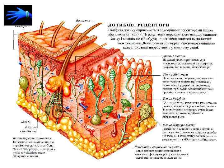 Шкірний аналізатор Тактильні рецептори Дотику Øнервові закінчення біля волосяної цибулини у шкірі, що вкрита волоссям Ø тельця Мейснера у шкірі, що позбавлена волосся і судинах шкіри Øтельця Меркеля в епітелії шкіри рук, ніг, грудей, спини Тиску Øпластинчасті тельця Пачіні в глибоких шарах шкіри, сухожиллях, зв’язках, очеревені