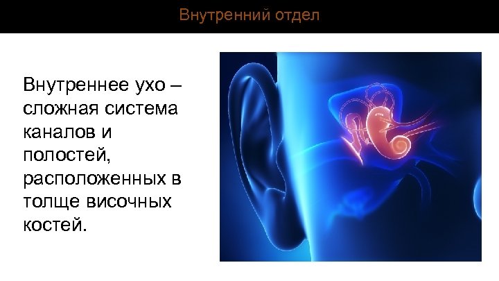 Внутренний отдел Внутреннее ухо – сложная система каналов и полостей, расположенных в толще височных костей.