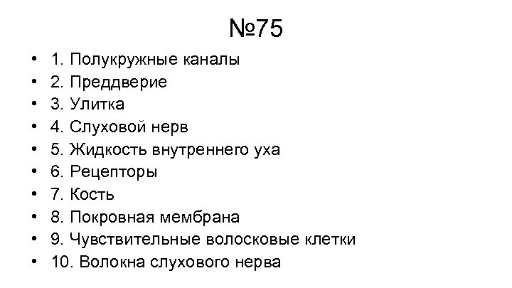 № 75 • • • 1. Полукружные каналы 2. Преддверие 3. Улитка 4. Слуховой нерв 5. Жидкость внутреннего уха 6. Рецепторы 7. Кость 8. Покровная мембрана 9. Чувствительные волосковые клетки 10. Волокна слухового нерва
