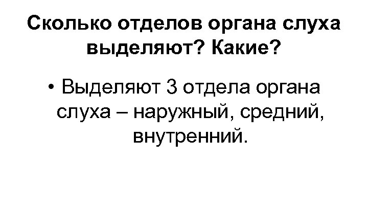 Сколько отделов органа слуха выделяют? Какие? • Выделяют 3 отдела органа слуха – наружный, средний, внутренний.