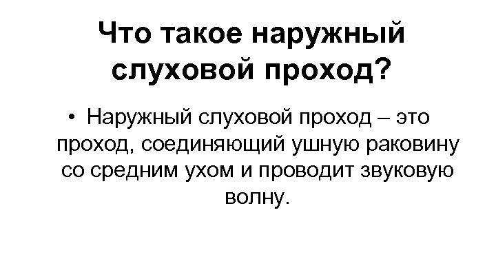 Что такое наружный слуховой проход? • Наружный слуховой проход – это проход, соединяющий ушную раковину со средним ухом и проводит звуковую волну.