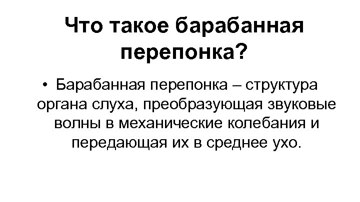 Что такое барабанная перепонка? • Барабанная перепонка – структура органа слуха, преобразующая звуковые волны в механические колебания и передающая их в среднее ухо.