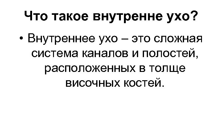 Что такое внутренне ухо? • Внутреннее ухо – это сложная система каналов и полостей, расположенных в толще височных костей.