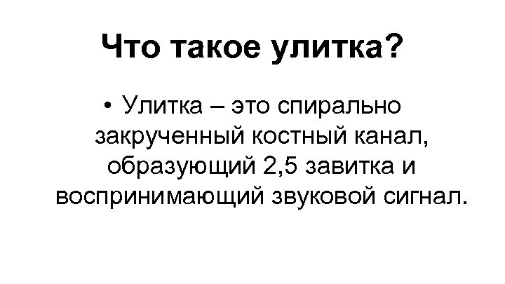 Что такое улитка? • Улитка – это спирально закрученный костный канал, образующий 2, 5 завитка и воспринимающий звуковой сигнал.