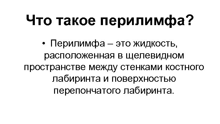 Что такое перилимфа? • Перилимфа – это жидкость, расположенная в щелевидном пространстве между стенками костного лабиринта и поверхностью перепончатого лабиринта.