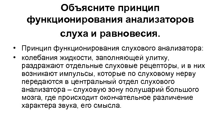 Объясните принцип функционирования анализаторов слуха и равновесия. • Принцип функционирования слухового анализатора: • колебания жидкости, заполняющей улитку, раздражают отдельные слуховые рецепторы, и в них возникают импульсы, которые по слуховому нерву передаются в центральный отдел слухового анализатора – слуховую зону полушарий большого мозга, где происходит окончательное различение характера звука, его смысла.