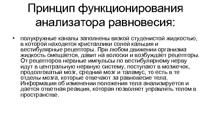 Принцип функционирования анализатора равновесия: • полукружные каналы заполнены вязкой студенистой жидкостью, в которой находятся кристаллики солей кальция и вестибулярные рецепторы. При любом движении организма жидкость смещается, давит на волоски и возбуждает рецепторы. От рецепторов нервные импульсы по вестибулярному нерву идут в центральную нервную систему, поступают в мозжечок, продолговатый мозг, средний мозг и таламус, то есть в те отделы мозга, которые отвечают за равновесие тела. Информация об изменении положения тела анализируется и дается ответная реакция, которая позволяет управлять телом в пространстве.