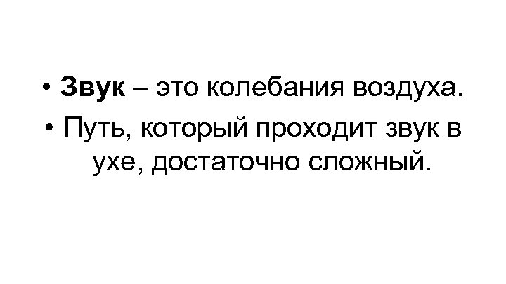 • Звук – это колебания воздуха. • Путь, который проходит звук в ухе, достаточно сложный.