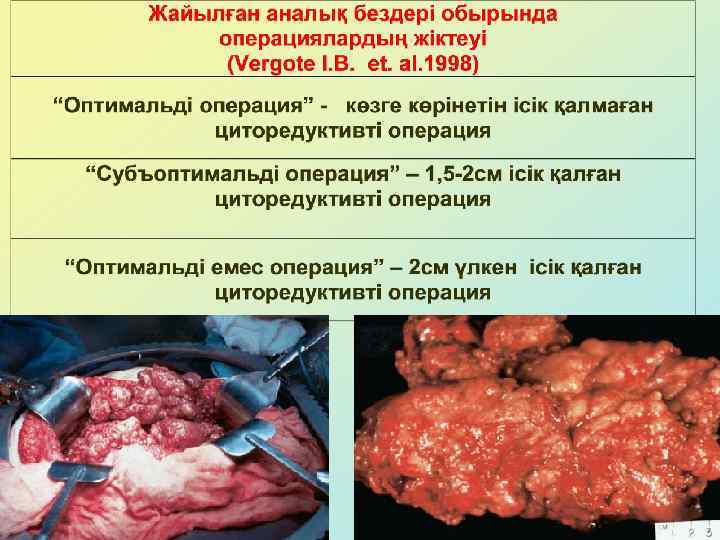 Негізгі түсініктер «СТАНДАРТТЫ ОПЕРАЦИЯ» термині – жатырдың қолсалқыларымен экстирпациясы және оментэктомия. «КЕҢЕЙТІЛГЕН ОПЕРАЦИЯ» термині – стандартты операция + мықын және/немесе парааортальді және/немесе шап лимфа түйіндерін алып тастау. «КОМБИНИРЛЕНГЕН ОПЕРАЦИЯ» термині – стандартты операция + ішектің, қуықтың, несеп ағардың резекциясы, спленэктомия және/немесе құрсақ қуысының басқа мүшелерін алып тастау.