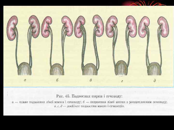 • Удвоение почки распознается при цистоскопии и рентгенологическом исследовании. Обычно поражается одна ее половина, чаще верхняя. Установлена повышенная склонность удвоенной почки (как и при ряде других аномалий) к некоторым заболеваниям (пиелонефрит, нефротуберкулез, нефролитиаз) в связи с нарушениями уродинамики и гемодинамики в неправильно развитых почках.