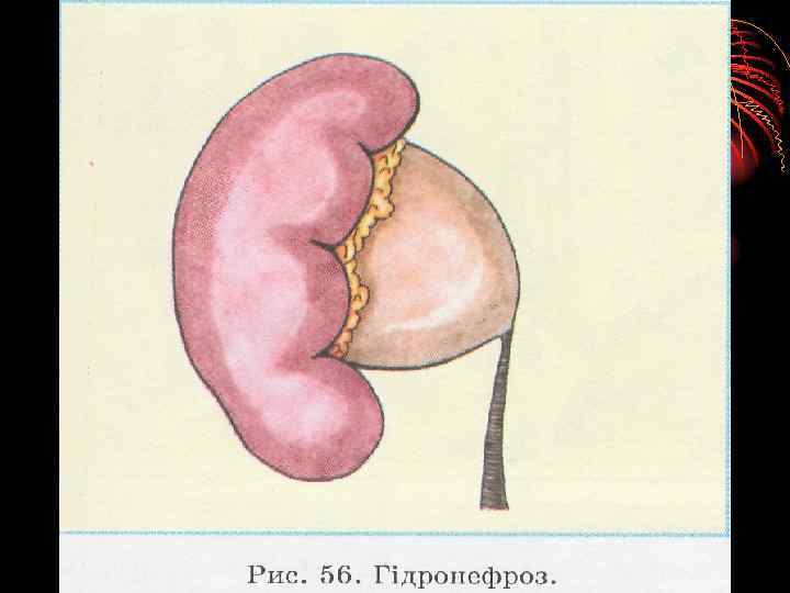 • Вторичный гидронефроз бывает обусловлен закупоркой мочеточника камнем, сдавлением его опухолью или воспалительным инфильтратом. Нарушение оттока приводит к постепенному расширению лоханки и чашечек и атрофии вещества почки, вмещая до нескольких литров мочи, прощупывается, а изредка обнаруживается при осмотре в виде выбухания в подреберье.