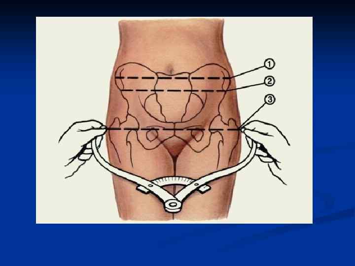 n Используя тазометр, врач определяет расстояние между большими вертелами костей бедер (норма – 30 см и более), передними остями (нормальный показатель – свыше 25 см), подвздошными гребнями (28 см и более). Также измеряется наружная и истинная коньюгата. Первый показатель определяется от верхней точки лобкового симфиза до надкрестцовой ямки и в норме должен составлять 20 см. Для измерения истиной коньюгаты проводится влагалищное обследование, в ходе которого определяется расстояние от верхнего участка крестцовой кости до лобкового сочленения.