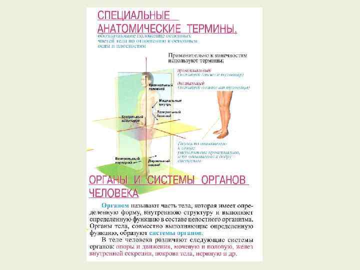Анатомические и "региональные" термины, а также термины, обозначающие направления Термин Передний (вентральный) Задний (дорсальный) Медиальный (внутренний) Латеральный (наружный) Проксимальный (ближний) Определение По направлению вперед По направлению назад По направлению к средней линии тела От средней линии тела По отношению к прикрепленному концу конечности, началу структуры или средней линии тела Дистальный (дальний) По отношению к проксимальному концу конечности. началу структуры или средней линии тел Цервикальный (шейный) "Региональный" термин, относящийся к области шеи Торакальный (грудной) "Региональным" термин, характеризующий часть тела между шеей и поясницей Поясничный "Региональным" термин, характеризующий область поясницы: участок между грудным отделом туловища и тазом Плантарный (подошвенный) Подошва или нижняя поверхность стопы Тыльный Верхняя (тыльная) поверхность стопы и наружная (тыльная) поверхность кисти Ладонный Внутренняя или ладонная поверхность кисти
