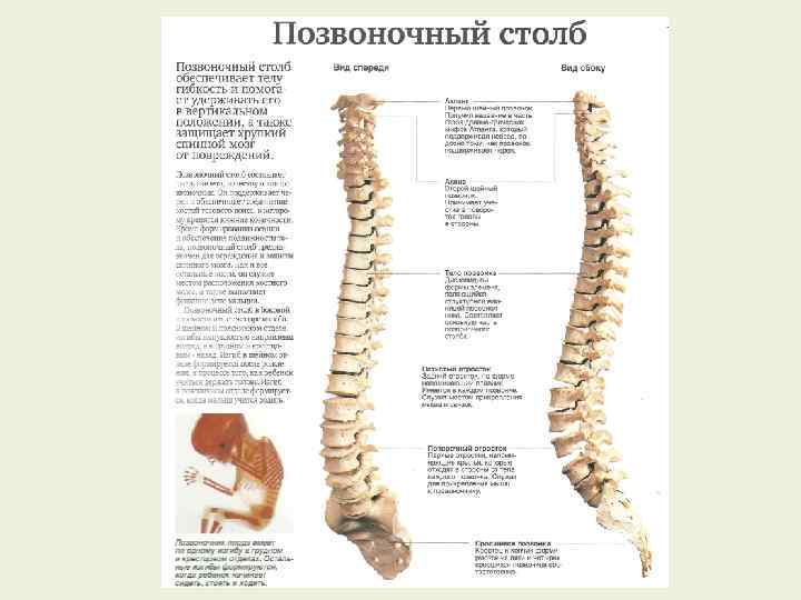 Позвоночный столб: А – вид спереди: I – шейные позвонки (7), II – грудные (12), III – поясничные (5); IV – крестец (5), V – копчик (4 -5); Б – распил через позвоноч. столб: I, III – шейный и пояснич. лордозы; II, IV-V – грудной и крестцово-копчиковый кифозы; В – появление изгибов позвоночника у детей в связи с держанием головы (а), при сидении (б) и стоянии (в)