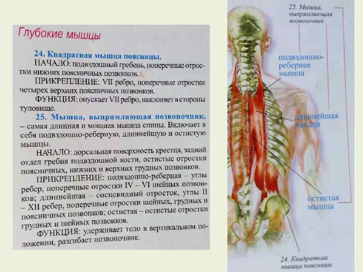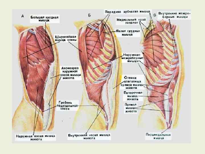 Основные мышцы, действующие на туловище, их функции, примерные упражнения Прямая мышца Сгибание и латеральное сгибание туловища (одностороннее действие) Поднимание туловища из положения лежа без помощи рук и ног (ноги согнуты в коленях), следить за правильным положением тела, поднимание таза. Наружная косая мышца Сгибание, латеральное сгибание и вращение туловища Поднимание туловища из положения лежа без помощи рук и ног с поворотами (в противоположную сторону) (ноги согнуты в коленях). Внутренняя косая мышца Сгибание, латеральное сгибание и вращение туловища Поднимание туловища из положения лежа без помощи рук и ног с поворотами (в ту же сторону) ноги согнуты в коленях Поперечная мышца живота Выпрямляющая позвоночник мышца Сжатие живота Разгибание туловища Отсутствие двигательной функции Приседания со штангой, поднимание тягой, упражнения на растягивание в положении лежа лицом вниз, поддержание правильного положения тела (осанка) в положении стоя