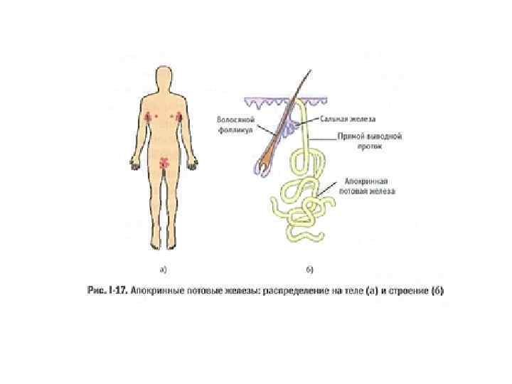 Потовые железы В организме имеются два типа потовых желез - апокринные и эккринные. Апокринные потовые железы располагаются в подмышечных и паховых областях, в ареолах молочных желез, коже половых органов и промежности (рис. І-17). Секреторная деятельность апокринных желез начинается с момента половой зрелости и продолжается в течение всей жизни, физиологически угасая с наступлением климакса. Считается, что именно апокринные потовые железы ответственны за характерный запах (особенно это важно в животном мире, где запах играет значимую роль в привлечении партнеров противоположного пола, для определения «свой-чужой›› и пр. )*. Выделяемый апокринными железами мутный густой секрет поступает в стержень волосяного фолликула.