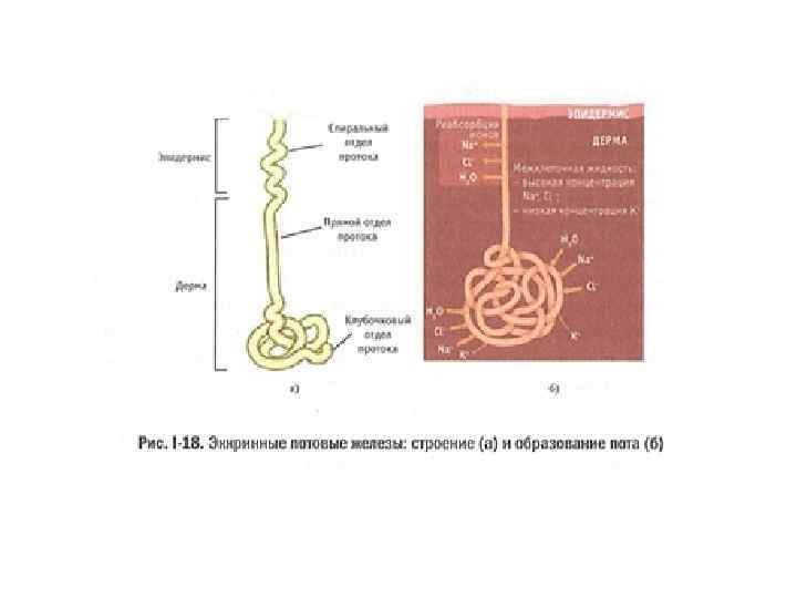 Эккринные потовые железы рассеяны по всей поверхности тела, особенно много их на ладонях, подошвах, в области подмышек, лица, груди и спины. Протоки эккринных желез открываются прямо на поверхность кожи (рис. І-18). Потовый секрет продуцируется эпителиальными клетками, выстилающими внутреннюю поверхность спиралевидного протока железы, и во время прохождения подвергается частичной реабсорбции. Капли пота, появляющиеся на поверхности кожи, представляют собой гипотонический раствор, основными компонентами которого являются вода, натрий и хлор. В поте также содержится небольшое количество калия, холестерина, мочевины и аммиака, в нем могут обнаруживаться следы кальция, фосфора, меди и магния, андрогенов. Потовый секрет, смешиваясь с кожным салом, образует кислотную мантию кожи.