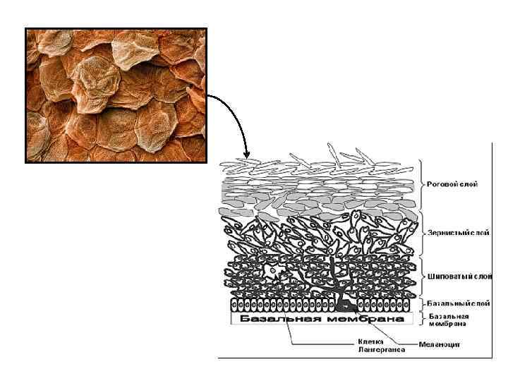 Эпидермис состоит главным образом из однотипных специализированных клеток (кератиноцитов), находящихся на разных стадиях созревания. По мере созревания кератиноциты продвигаются снизу вверх к поверхности кожи. Этот процесс организован так хорошо, что клетки движутся вверх единым пластом, «плечо к плечу» , и это позволяет выделить в эпидермисе отдельные слои, в каждом из которых будут находиться клетки на разных стадиях развития.