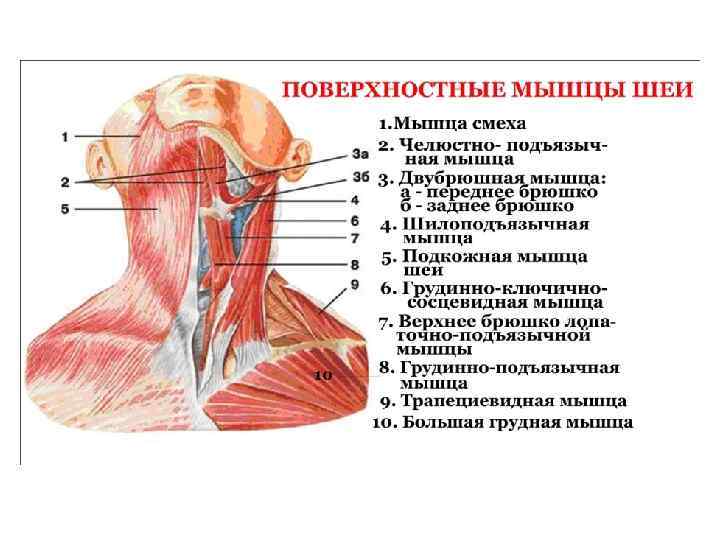 Мышцы головы и шеи; глубокий слой. 1 - латеральная крыловидная мышца (m. pterygoideus lateralis); 2 - щёчная мышца (m. buccinator); 3 - медиальная крыловидная мышца (m. pterygoideus medialis); 4 - щитоподъязычная мышца (m. thyrohyoideus); 5 - грудино-щитовидная мышца (m. sternothyroideus); 6 - грудино-подъязычная мышца (m. sternolyoideus); 7 - передняя лестничная мышца (m. scalenus anterior); 8 - средняя лестничная мышца (m. scalenus medius); 9 - задняя лестничная мышца (m. scalenus posterior); 10 - трапециевидная мышца (m. trapezius) [1989 Липченко В Я Самусев Р П - Атлас нормальной анатомии человека]
