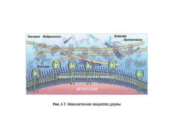 • Внеклеточное (межклеточное) вещество -среда обитания клеток, гелеобразная масса, располагающаяся между клетками. Состав межклеточного вещества специфичен для разных тканей. Если говорить о дермальном слое, то основу межклеточного вещества составляют крупные полимерные молекулы - протеогликаны и гликозаминогликаны, удерживающие воду. В это желе погружены клетки (фибробласты) и сеть нерастворимых коллагеново-эластиновых волокон. Межклеточное вещество является также средой, в которой путешествуют биологически активные сигнальные молекулы. Клетки при передвижении также прикрепляются к межклеточному веществу.