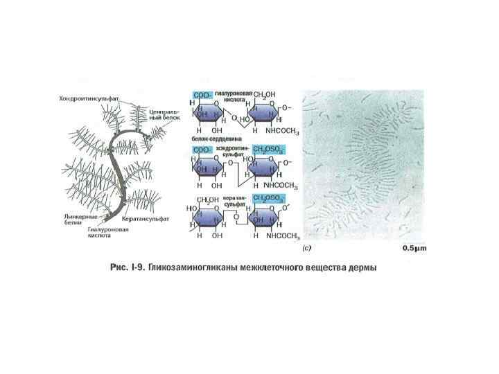 Вся эта пружинистая волокнистая конструкция погружена в гликозаминогликановый гель. Гликозаминогликаны, большие полисахаридные молекулы, в воде не растворяются, а превращаются в сеточку, ячейки которой захватывают большое количество воды образуется вязкий гель. Главным гликозаминогликаном дермы является гиалуроновая кислота, имеющая самую большую молекулярную массу и связывающая больше всего воды (рис. І-9).