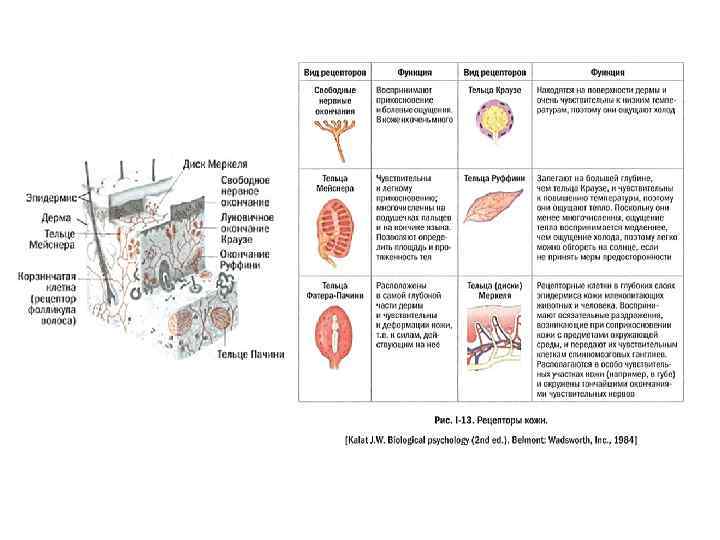 Рецепторы кожи Кожа представляет собой огромное рецепторное поле, чувствительное к самым разным сигналам (рис. І-13). В коже находятся: • терморецепторы, воспринимающие изменения температуры, • механорецепторы, регистрирующие прикосновение к коже, сдавливание, вибрацию, • ноцирецепторы, реагирующие на болевые раздражения. В коже человека преобладают рецепторы прикосновения. По -видимому, каждый отдельный рецептор воспринимает определенное осязательное ощущение, но при воздействии на кожу различных механических стимулов одновременно реагирует несколько типов рецепторов.