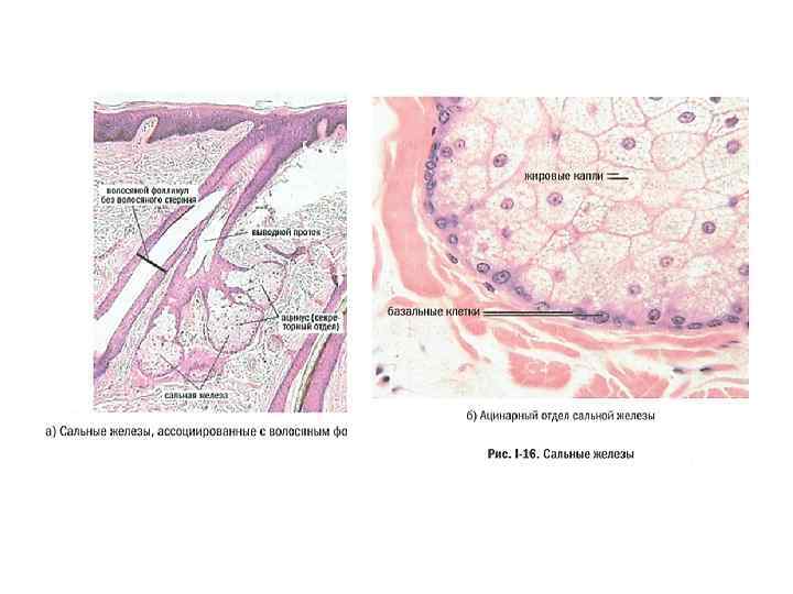 У людей волосяные луковицы также имеют «свои собственные» сальные железы, но все же большая часть сальных желез располагается вне всякой связи с волосами, изливая свой секрет прямо на поверхность кожи. Нормально секретирующие сальные железы обеспечивают смягчение верхнего слоя кожи, антимикробную защиту и отчасти помогают роговому слою сдерживать испарение воды. Выработку кожного сала регулируют мужские половые гормоны – андрогены. Чем выше уровень андрогенов в коже, тем быстрее размножаются клетки сальной железы и тем больше кожного сала выбрасывается на поверхность кожи. Кожа подростков, переживающих в период полового созревания гормональные бури, часто страдает от избыточной продукции кожного сала. Такая же ситуация и у женщин, организм которых производит слишком много мужских половых гормонов.