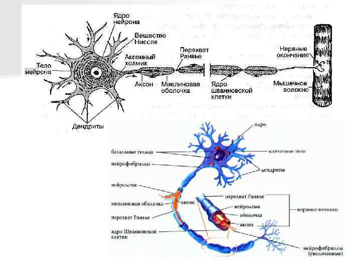 Схема строения тела нейрона 1 – тигроид; 2, аксон; 3 – дендрит ; 4 – ядро; 5 – нейрофибриллы. 1 – отросток; 2 – гранулярная ЭПС; 3 – комплекс Гольджи; 4 – микротрубочки, микрофиламенты; 5 – митохондрии; 6 – гладкая ЭПС; 7 – ядро; 8 – ядрышко.