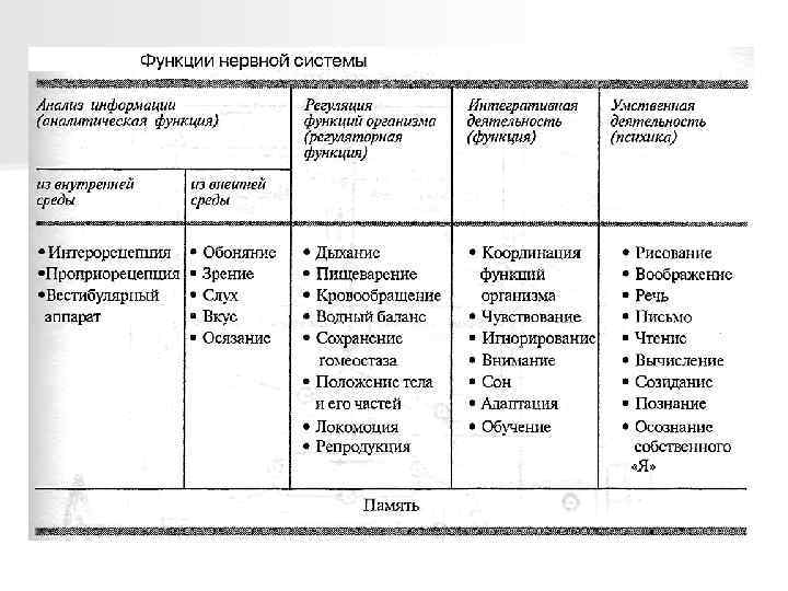ФУНКЦИИ НЕРВНОЙ СИСТЕМЫ Интегративная функция n Регуляторная функция n Сенсорная функция n Функция отражения n Функция памяти n Программирование поведения n Контроль за выполнением программ поведения n