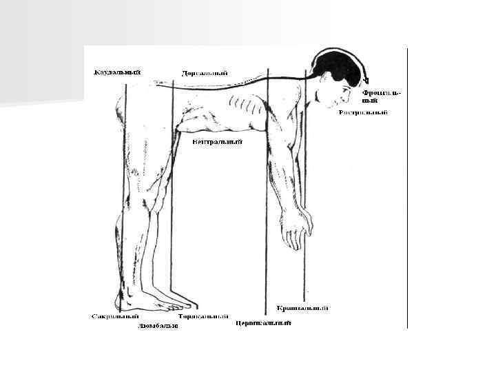 Анатомические термины n n n Медиальный – срединный, центральный. ( «Располагается медиальнее чеголибо» говорят о структуре, находящейся между указанным ориентиром и центральной осью тела); Вентральный – расположенный ближе к животу (передней поверхности); Дорсальный – расположенный ближе к спине (задней поверхности); Проксимальный – расположенный ближе к центру (например, к центральной оси тела); Дистальный – расположенный дальше от центра; Афферентный – приносящий (употребляется применительно к нейрону, по которому импульсы поступают в ЦНС); Эфферентный – выносящий (употребляется применительно к нейрону, по которому импульсы покидают ЦНС); Ипсилатеральный – расположенный, или проходящий (о нервных путях) на одноимённой стороне; Контрлатеральный – расположенный, или проходящий (о нервных путях) на противоположной стороне. Краниальный (греч. «cranium» – череп) и ростральный (от лат. «rostrum» – клюв, носовая часть корабля) – при описании структур, находящихся ближе к голове (к верхней части тела); Каудальный – при описании структур, находящихся дальше о головы (ближе к хвосту, лат. «cauda» – хвост). Последние два термина перешли в анатомию человека из анатомии животных.