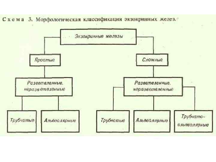 Железистый эпителий осуществляет секреторную функцию, т. е. образует и выделяет специфические продукты – секреты, которые используются в процессах, протекающих в организме. К секретам относятся пищеварительный сок, слизь, желчь, гормоны и др. Железистый эпителий образует железы, большая часть которых представляет собой самостоятельные органы (слюнные железы, поджелудочная железа, надпочечники и т. д. ) По строению железы бывают простые и сложные, по форме - трубчатые, альвеолярные и альвеолярно-трубчатые, по способу выделения секрета - железы внутренней (эндокринные) и внешней (экзокринные) секреции а-трубчатая; б - альвеолярная; в-трубчато-альвеолярная
