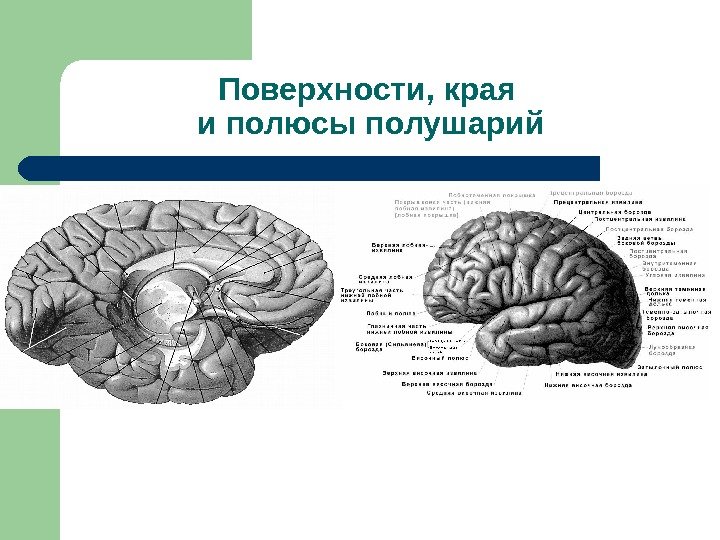 В полушариях различают: Три поверхности : верхне-латеральная, медиальная и нижняя Три края : верхний, нижний медиальный и нижний латеральный Три полюса : передний, задний и височный