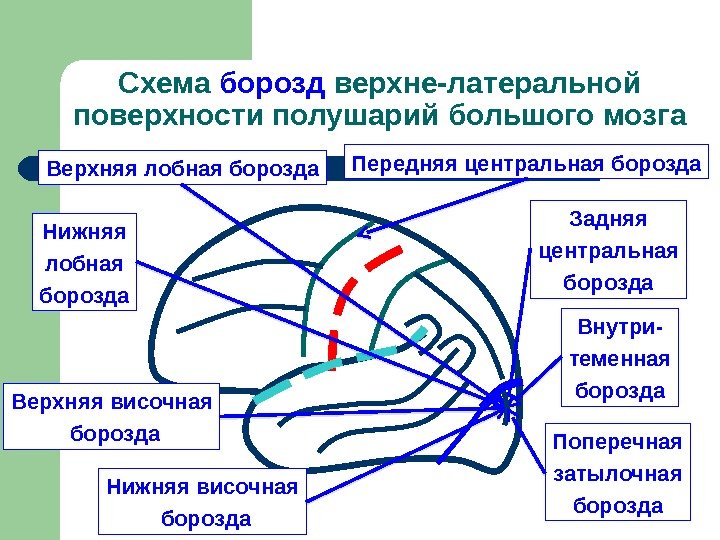 Схема борозд верхне-латеральной поверхности полушарий большого мозга Передняя центральная борозда Задняя центральная борозда Внутри- теменная борозда. Верхняя лобная борозда Нижняя лобная борозда Верхняя височная борозда Нижняя височная борозда Поперечная затылочная борозда