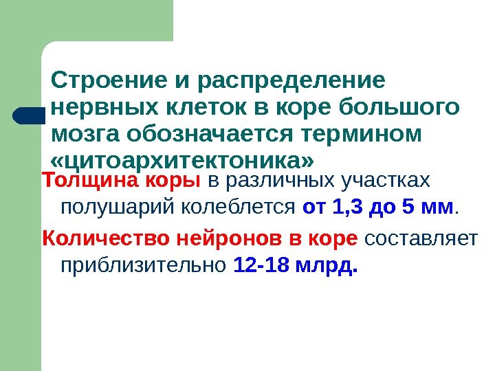 Строение и распределение нервных клеток в коре большого мозга обозначается термином «цитоархитектоника» Толщина коры в различных участках полушарий колеблется от 1, 3 до 5 мм. Количество нейронов в коре составляет приблизительно 12 -18 млрд.