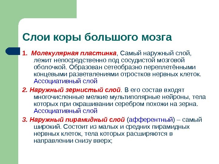 Слои коры большого мозга 1. Молекулярная пластинка , Самый наружный слой, лежит непосредственно под сосудистой мозговой оболочкой. Образован сетеобразно переплетёнными концевыми разветвлениями отростков нервных клеток. Ассоциативный слой 2. Наружный зернистый слой. В его состав входят многочисленные мелкие мультиполярные нейроны, тела которых при окрашивании серебром похожи на зерна. Ассоциативный слой 3. Наружный пирамидный слой ( афферентный ) – самый широкий. Состоит из малых и средних пирамидных нервных клеток, тела которых расширяются в направлении снизу вверх;