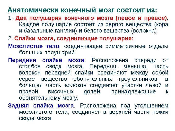 Анатомически конечный мозг состоит из: 1. Два полушария конечного мозга (левое и правое). Каждое полушарие состоит из серого вещества (кора и базальные ганглии) и белого вещества (волокна) 2. Спайки мозга, соединяющие полушария: Мозолистое тело , соединяющее симметричные отделы больших полушарий Передняя спайка мозга. Расположена спереди от столбов свода мозга. Передняя, меньшая часть волокон передней спайки соединяют между собой серое вещество обонятельных треугольников, а большая часть волокон соединяет участки левой и правой височных долей, принадлежащие к обонятельному мозгу. Задняя спайка мозга. Расположена под утолщением мозолистого тела, соединяет в верхней части ножки свода мозга