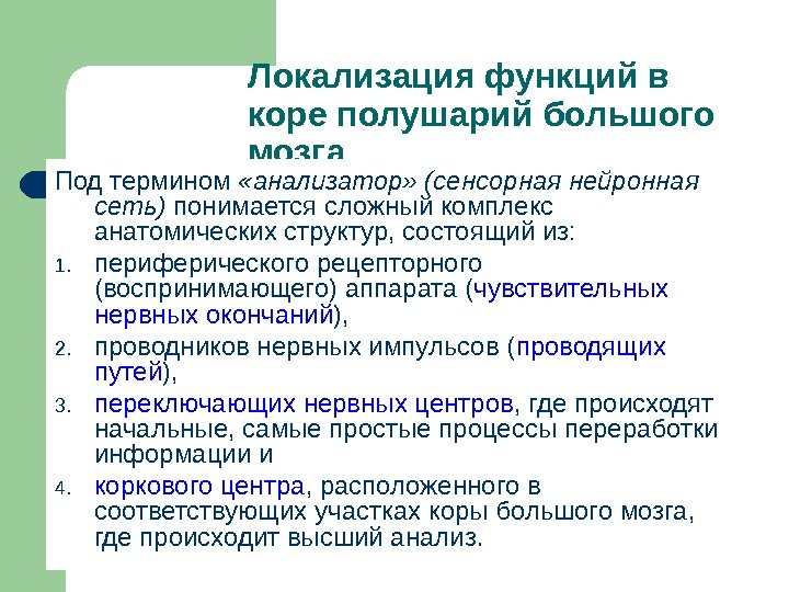 Локализация функций в коре полушарий большого мозга Понятие об анализаторе. Под термином «анализатор» (сенсорная нейронная сеть) понимается сложный комплекс анатомических структур, состоящий из: 1. периферического рецепторного (воспринимающего) аппарата ( чувствительных нервных окончаний ), 2. проводников нервных импульсов ( проводящих путей ), 3. переключающих нервных центров , где происходят начальные, самые простые процессы переработки информации и 4. коркового центра , расположенного в соответствующих участках коры большого мозга, где происходит высший анализ.