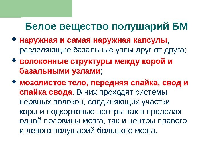 Белое вещество полушарий БМ наружная и самая наружная капсулы , разделяющие базальные узлы друг от друга; волоконные структуры между корой и базальными узлами ; мозолистое тело, передняя спайка, свод и спайка свода. В них проходят системы нервных волокон, соединяющих участки коры и подкорковые центры как в пределах одной половины мозга, так и центры правого и левого полушарий большого мозга.